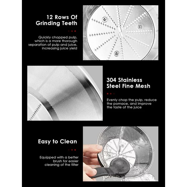 Why the AICOOK Juicer –With a corrosion-resistant food grade 304 stainless steel sharp blades and three-layer mesh filter, quickly make a cup of healthy pure juice without destroying the natural flavor and nutritional benefits, extracts up to 26% more juice and 36% more vitamins and minerals. Dual Speed Versatility Juicer - Upgrade the motor for faster juicing but lower noise, under 60dB. It can create a cup of juice in just 6 seconds."Ⅰ" low speed, 13000-17000 RPM, for soft fruits like oranges, tomatoes and others; "Ⅱ" fast speed, 17000-21000 RPM, for hard fruits like carrot, celery, and others. Give you a quieter and more healthy juice life. Larger Feed Chute and Easy to Clean - 3'' feed chute, completely free your hands, no need to slice for fruits and vegetables smaller than the feed chute. BPA FREE MATERIAL, compact and simple structure, easy to assemble and disassemble. Equipped with brushes to make your cleaning easier and faster.