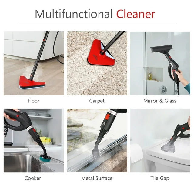- 【Free 18 Accessories】 Equipped for steam cleaning jobs in and around your home including a glass brush, floor brush, carpet glider, triangle brush, ironing brush, nylon brush, brass brush, measuring cup and more. Works great as floor steam mop, carpet cleaner, steam cleaner, garment steamer, window, mirror & glass cleaner and more